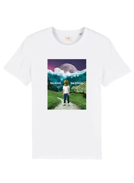 T-Shirt Klout. Modèle Tsunami. Couleur blanc. Col rond. Manche court. Regular fit Illustration tamponnée sur partie avant. Fabriqué en coton biologique. Conçu en Galice, Espagne.