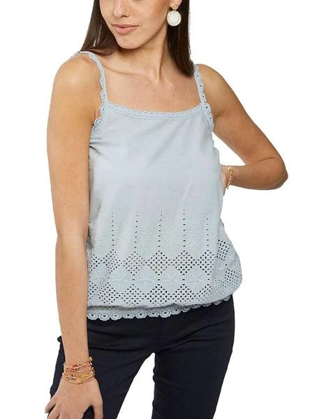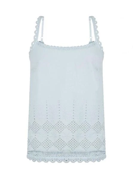 T-Shirt Naf Naf. Modèle crochet. Bleu clair. Sans manches. Détails en bas avec crochet. Avec la pointe des pieds. Encolure carrée. Le mannequin porte une taille S.