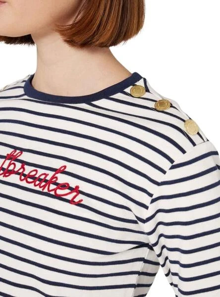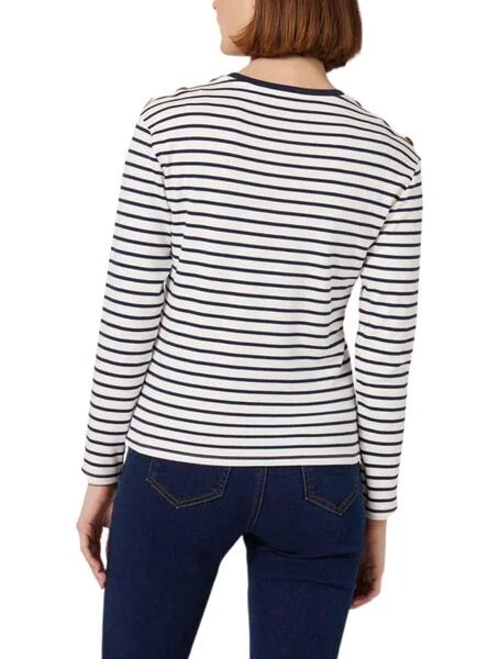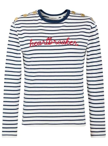 T-Shirt Naf Naf. Disjoncteur modèle Heart. Manche longue. Col rond. Texte en relief sur la poitrine. Détail de boutons sur les épaules. Conception selon Rayures.