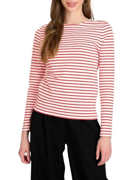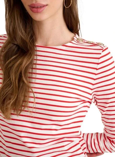 T-shirt Naf Naf. Modèle Marin. Couleur rouge. Manches longues. Col rond. DĂ©tail de boutons dorĂ©s sur l’Ă©paule. ImprimĂ© Ă rayures.
