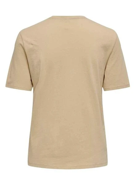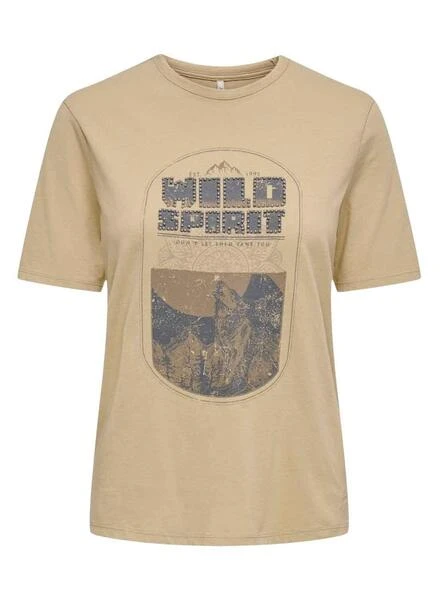 T-Shirt Only. Modèle Lucie. Couleur beige. Col rond. Manche court. Effet vintage. Printed dans les tons bleus. Inspiration montagne. Mensage avec perles.