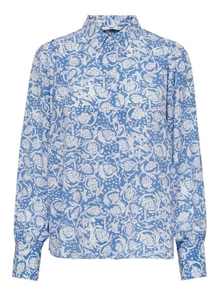 T-Shirt Only. Modèle Margot. Couleur bleu. Manche longue. Col de chemise. Fermeture boutonnée. Intégrale Printed.