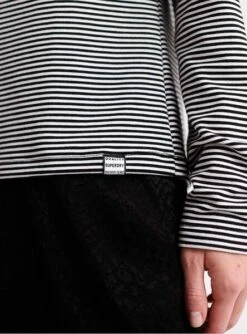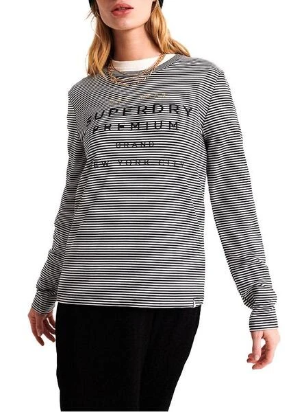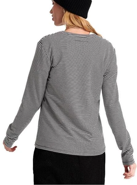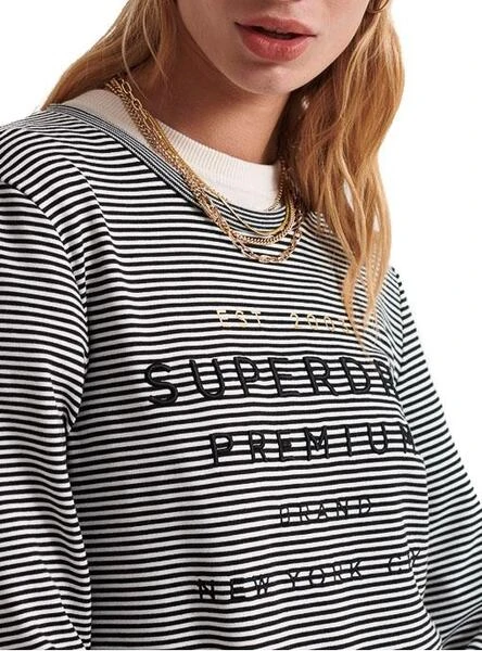 T-Shirt Superdry. Modèle Dunne. Couleur noire Col tour. Manche longue. Motif rayé. imprimé broderie graphique et à la poitrine.