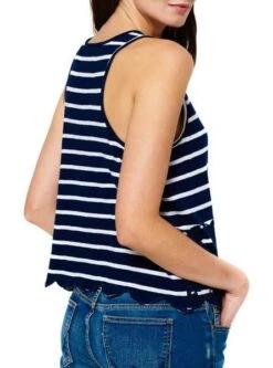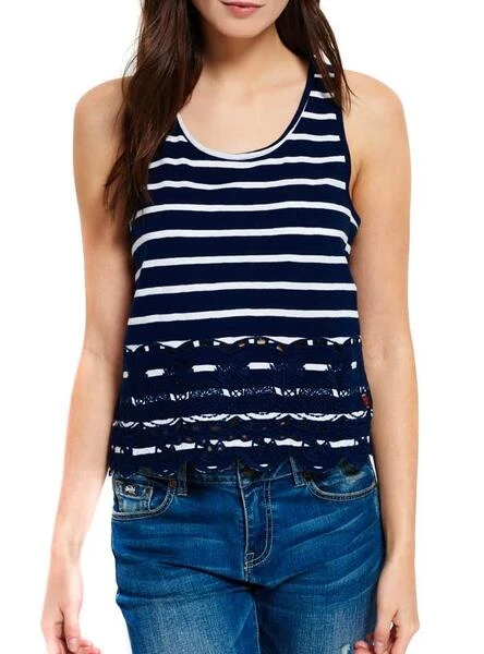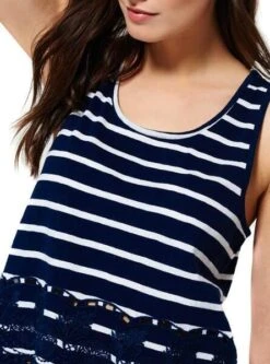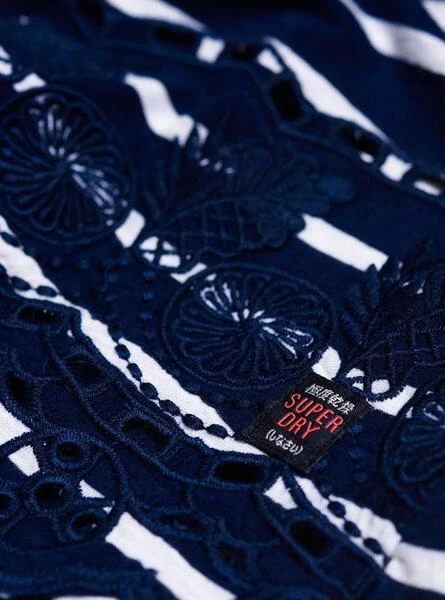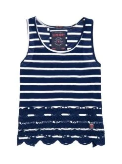 T-Shirt Superdry. Sans manches. Col rond. Couleur bleu. Impression de liste. DĂ©tails brodĂ©s sur l’ourlet. Logo de la marque au-dessus de l’ourlet. Regular fit. Le mannequin porte une taille S.