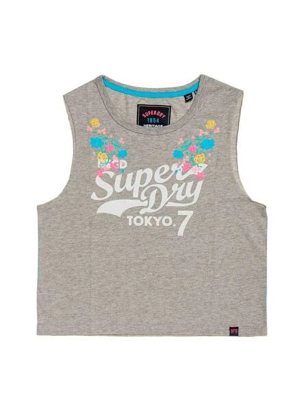 T-Shirt Superdry. Modèle de Tokyo. Gris. Sans manches Étiquette de marque sur le devant. Col rond. logo sur la poitrine. Imprimé floral. Format court