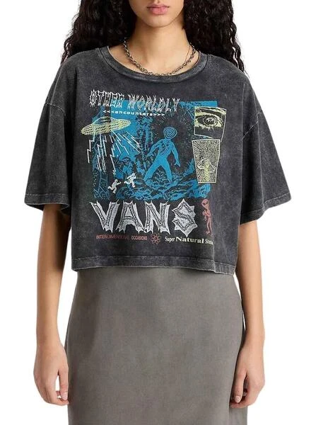 Débardeur Vans. Couleur noire. Tissu lavé. Manches courtes. Col rond. Impression graphique sur le devant. Coupe courte. Ajustement ample.