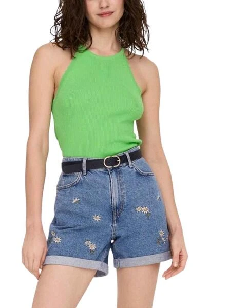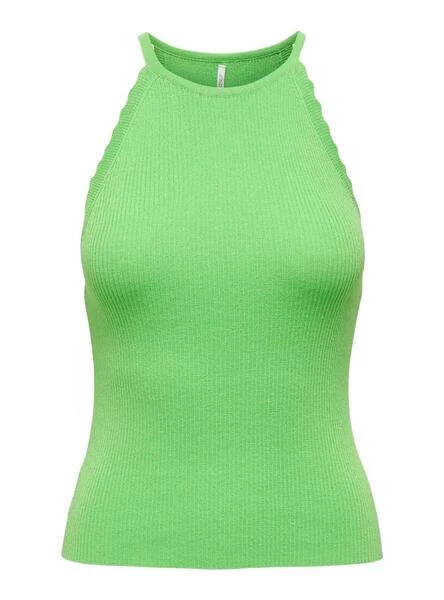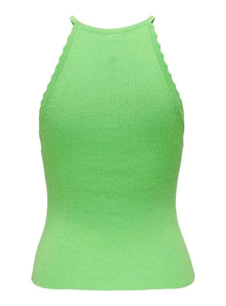 Top Only. Col rond. Couleur vert. Tricot. Sans manches. Format ajusté. Le mannequin porte une taille S.