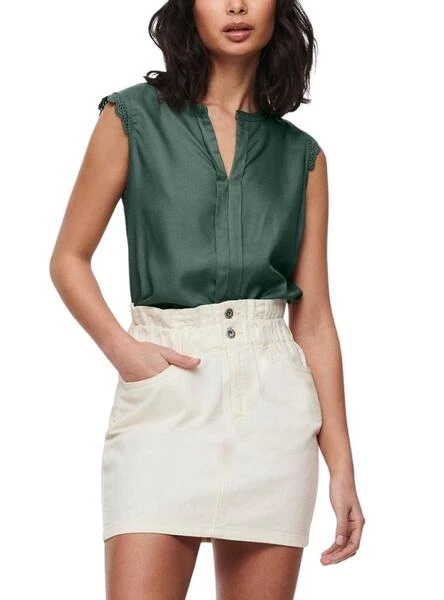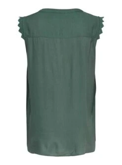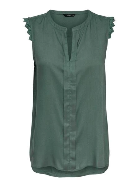 Top Only. Modèle Kimmi. Couleur verte. Sans manches. Col en V. Tissu léger. Dentelle aux emmanchures.