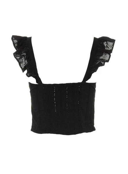 Top Only. Modèle Maria. Avec tissu cĂ´telĂ©. Manches aux emmanchures avec volants. Dos Ă©lastiquĂ© avec nid d’abeille. SerrĂ©. Col en V. Le mannequin porte une taille S.