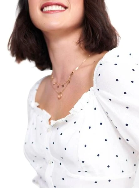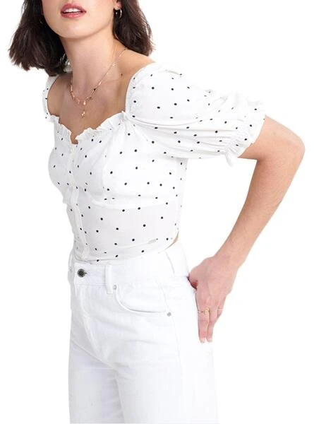 Top Superdry. Modèle Quincy. Couleur blanche. ImprimĂ© Ă pois. Format court. Manches courtes. Fermeture boutonnĂ©e sur le devant. Dos avec nid d’abeille. DĂ©tail Ă volants. Le mannequin porte une taille S.
