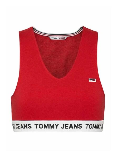 Top Tommy Jeans. Couleur rouge. Décolleté en V. Sans manches. Bande élastique en bas avec le logo de la marque. Petit drapeau sur le côté de la poitrine.