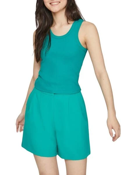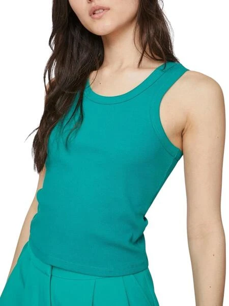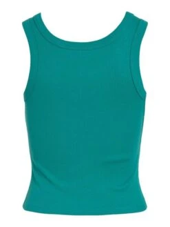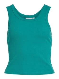 Top Vila. Modèle côte. Couleur turquoise. Sans manches. Col rond. Tissu extensible. coupe régulière.