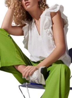 Top Vila. Modèle Tovan. Couleur blanche. Manches courtes avec volants. Détails en dentelle. Col en V. Coupe régulière.