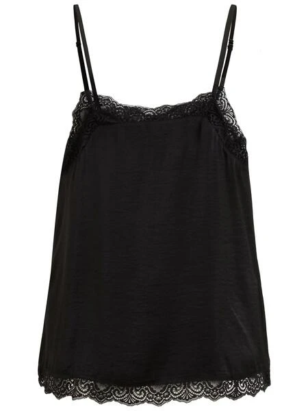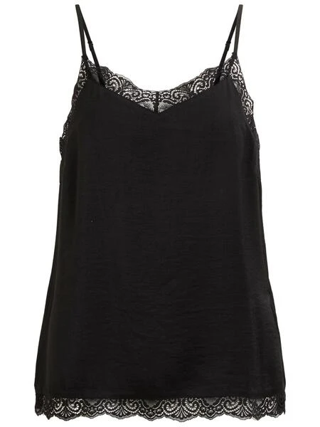 Top Vila. Modèle Vicava. Couleur noire. Col en V. Avec bretelles rĂ©glables. Avec de la dentelle Ă l’encolure et Ă l’ourlet. Tissu lĂ©ger. Regular fit. Le mannequin porte une taille S.