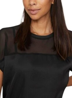 Top Vila. Modèle Villette. Couleur noire. Col rond. Manches courtes. Partie supérieure en maille transparente. Tissu satiné. Coupe régulière.